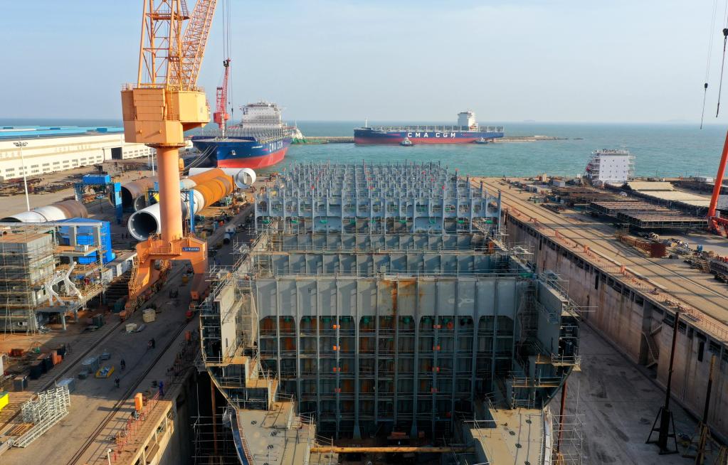 今年以來(lái),山東青島造船廠(chǎng)來(lái)自國外的集裝箱船、散貨船等訂單飽滿(mǎn),生產(chǎn)訂單已排至2025年。