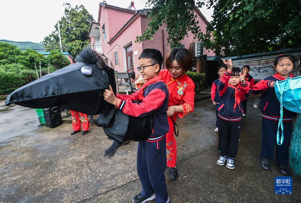 5月24日,長(cháng)興縣煤山鎮中心小學(xué)的學(xué)生在新民村學(xué)習新民馬燈舞蹈。