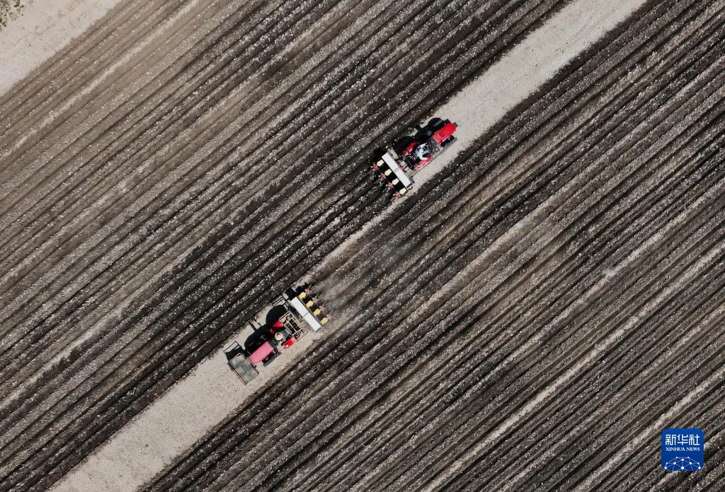 5月24日,唐山市豐南區王蘭莊鎮的農民在田間使用農機進(jìn)行大豆、玉米帶狀復合種植(無(wú)人機照片)。