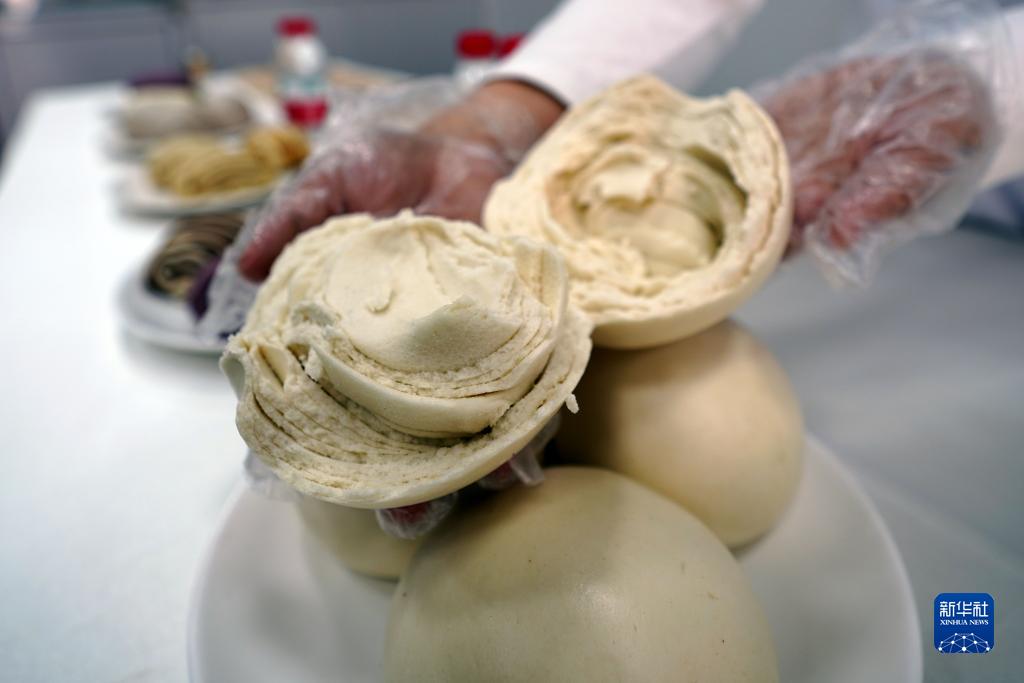 5月25日,在河北滄州渤海新區黃驊市一家農業(yè)科技公司產(chǎn)品展示廳,工作人員展示旱堿麥千層饅頭。