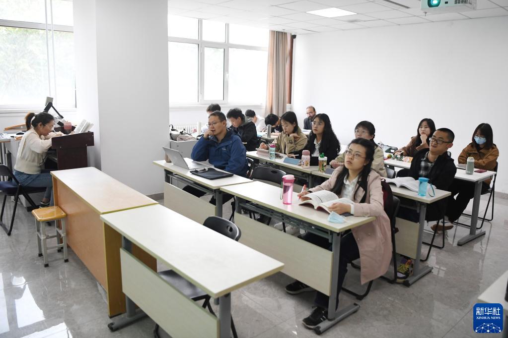 謝炎廷(右二)和同學(xué)在蘭州大學(xué)上課(5月10日攝)。