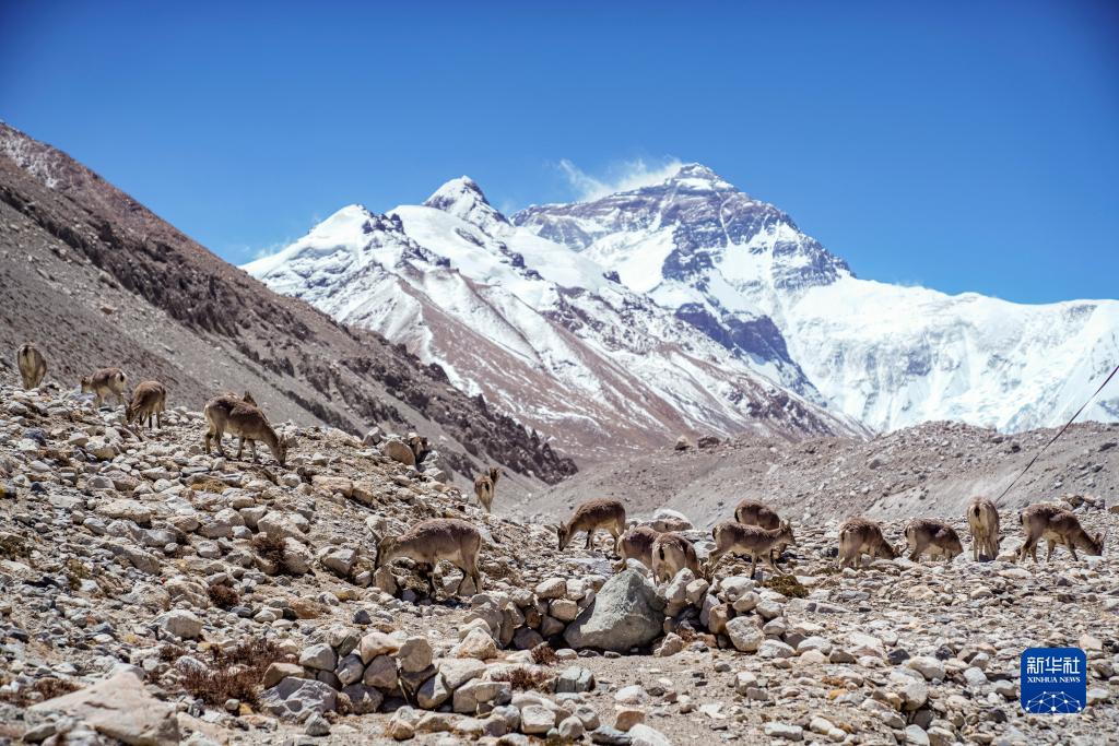一群巖羊在珠峰腳下覓食(5月9日攝)。
