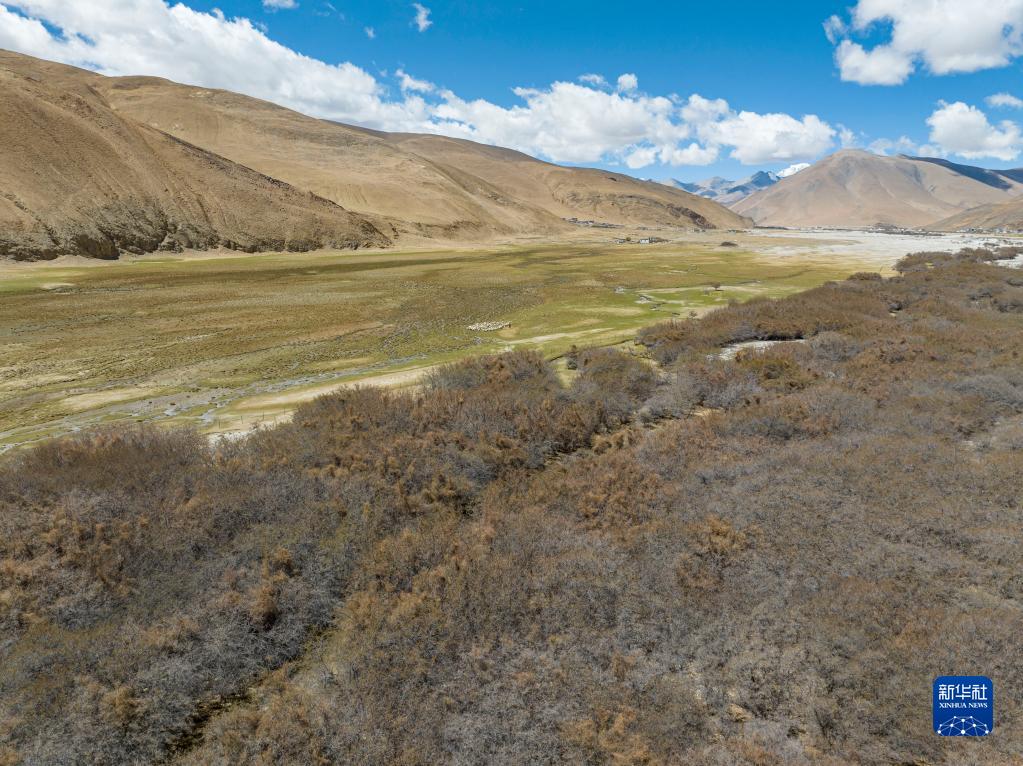 這是在珠峰國家級自然保護區內拍攝的沙棘林和濕地(5月25日攝,無(wú)人機照片)。
