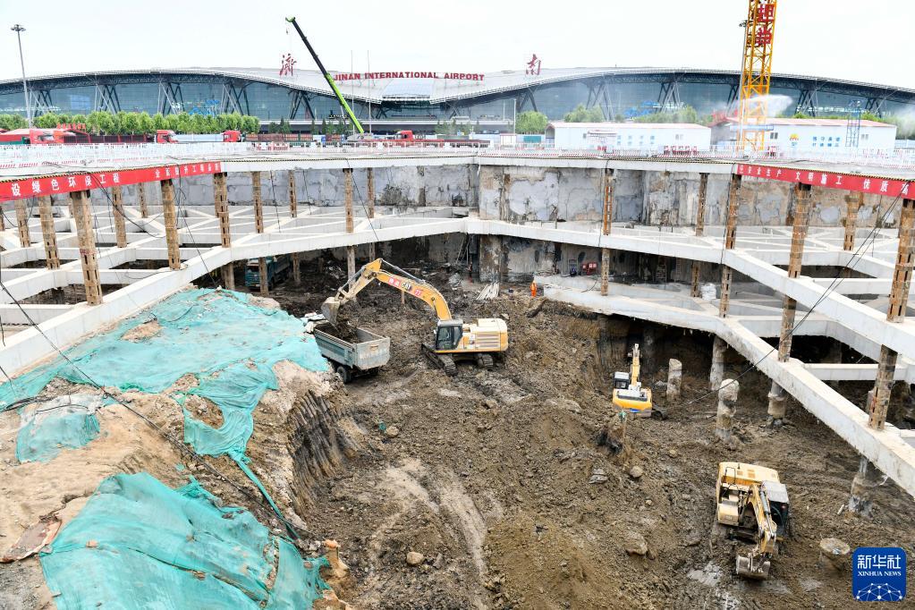 5月25日,施工人員在濟南遙墻機場(chǎng)綜合交通樞紐工程施工現場(chǎng)挖掘地鐵車(chē)站基坑。