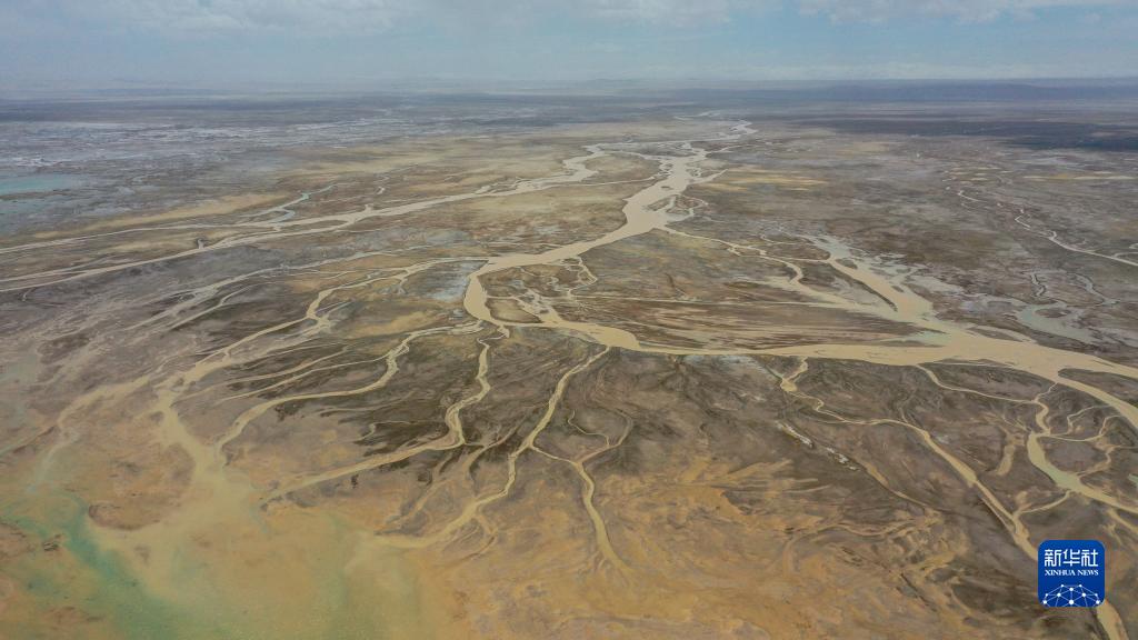 這是在新疆東昆侖庫木庫里盆地拍攝的阿雅克庫木湖河流入湖口(5月23日攝,無(wú)人機照片)。