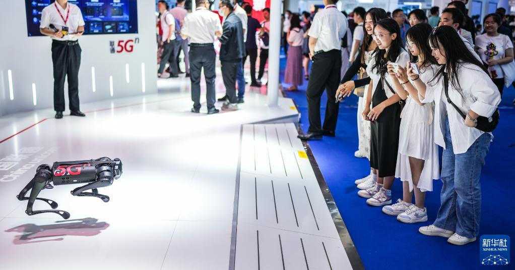 5月26日,參觀(guān)者在數博會(huì )展館內參觀(guān)智能機器狗。