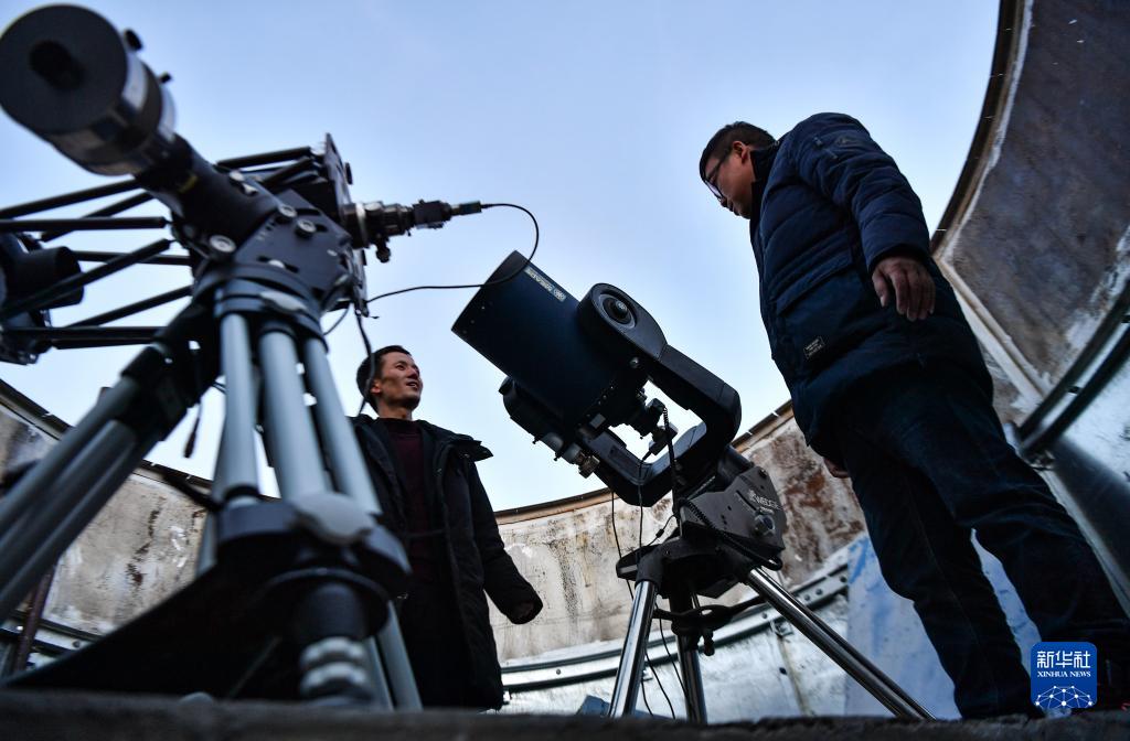 尤顯龍(左)和同事唐鵬在調試望遠鏡(5月23日攝)。