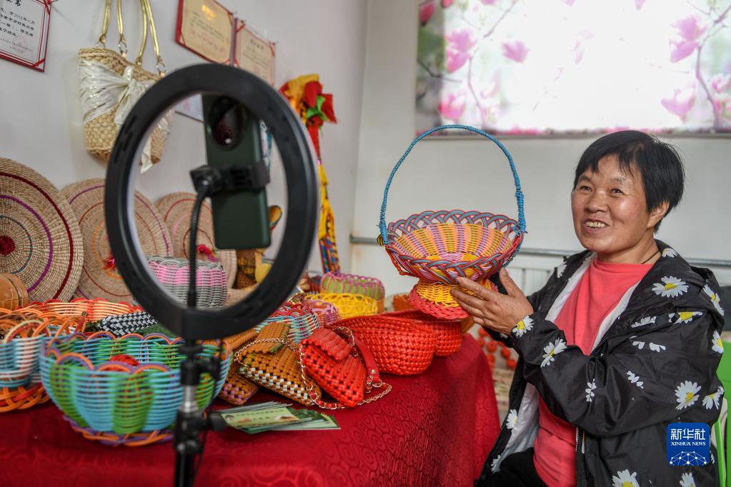 5月26日,孝里街道南黃村村民王殿梅在家中通過(guò)電商平臺推介自己制作的編織產(chǎn)品。