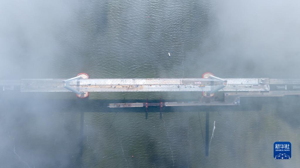 5月25日拍攝的建設中的鷺洲大橋(無(wú)人機全景照片)。
