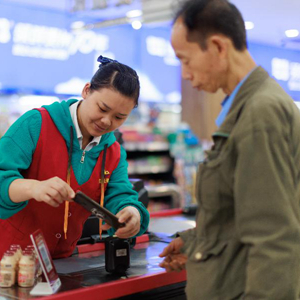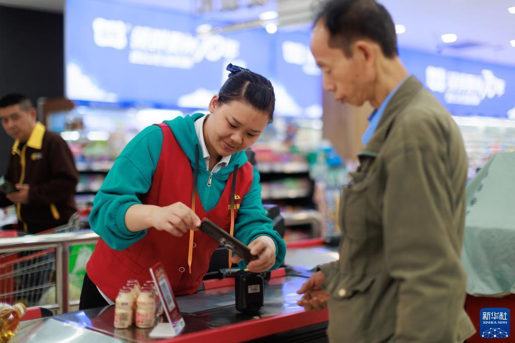 5月23日,顧客在黔南州一超市內使用“數字底座”黔南一碼付進(jìn)行購物。