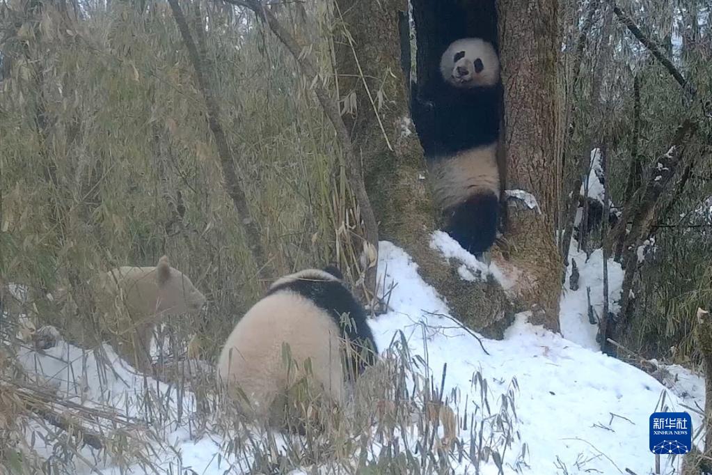 這是2月份,紅外相機拍攝到的白色大熊貓(左一)與一對大熊貓母子同框的畫(huà)面。