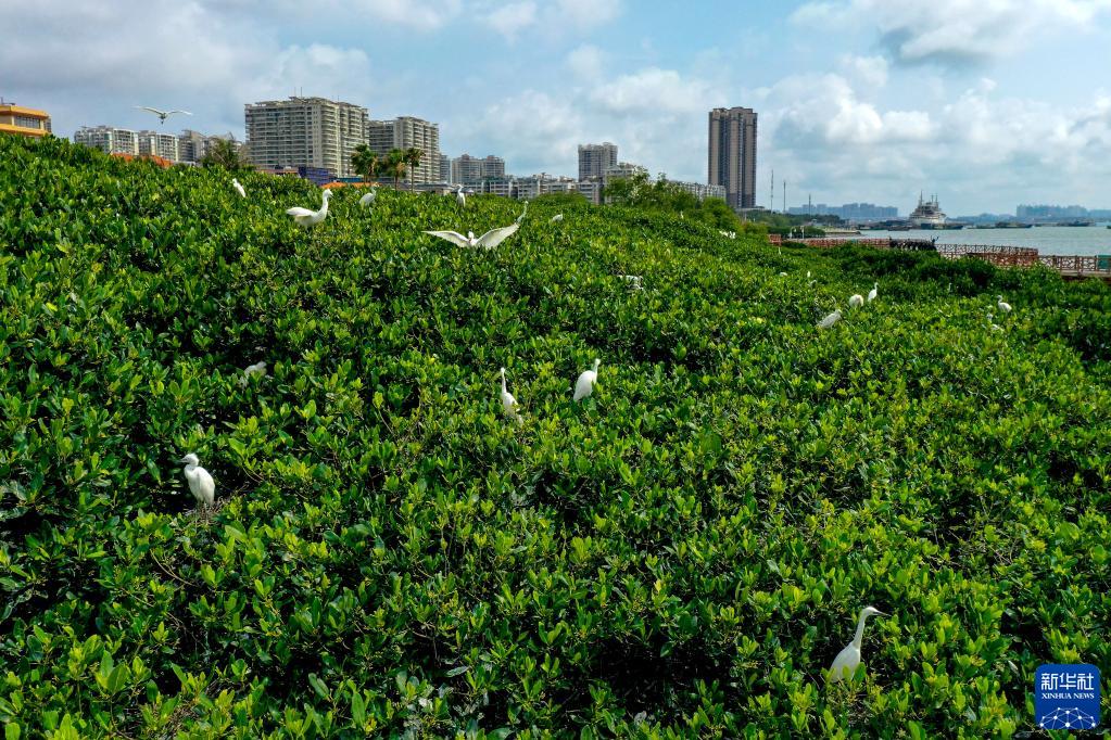 鳥(niǎo)類(lèi)在湛江市霞山區觀(guān)海長(cháng)廊一帶的紅樹(shù)林里棲息(5月25日攝,無(wú)人機照片)。