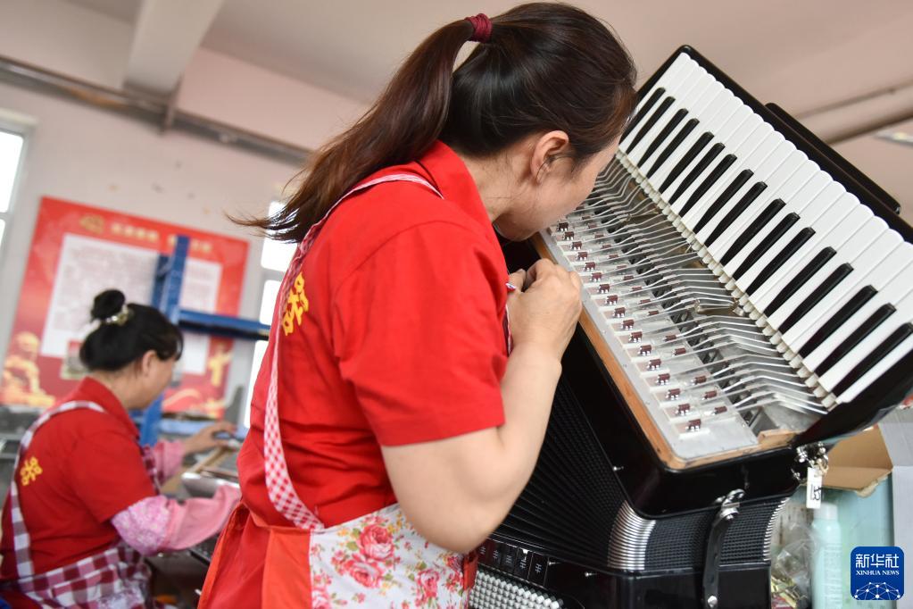 5月25日,在天津鸚鵡樂(lè )器有限公司,工人在裝配一臺鍵盤(pán)式手風(fēng)琴。
