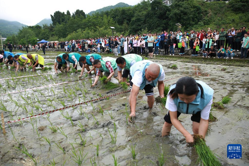 5月27日,秭歸縣九畹溪鎮農民參加插秧比賽。