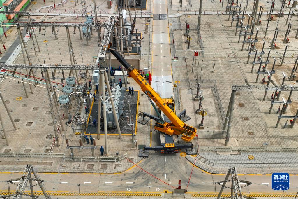 5月27日,電力工人在工程現場(chǎng)進(jìn)行檢修作業(yè)(無(wú)人機照片)。