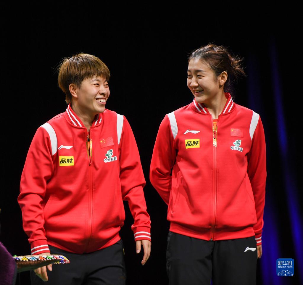 當日,2023年世界乒乓球錦標賽女雙頒獎儀式在南非德班舉行。在女雙決賽中,中國組合陳夢(mèng)/王藝迪以3比0戰勝韓國組合田志希/申裕斌,奪得冠軍。
