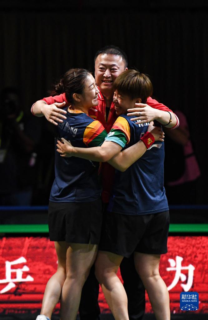 5月27日,陳夢(mèng)(左)/王藝迪(右)與教練馬琳慶祝勝利。