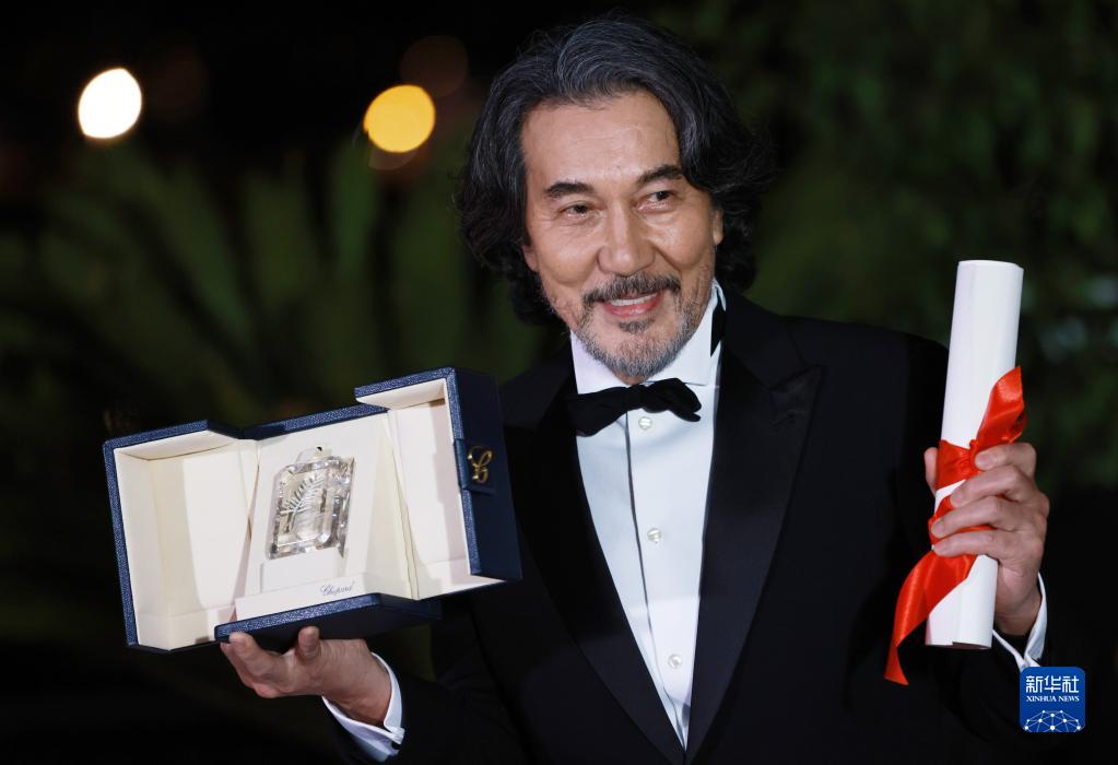 5月27日,在法國戛納,憑借影片《完美的日子》獲得電影節最佳男演員獎的日本演員役所廣司展示獎杯。