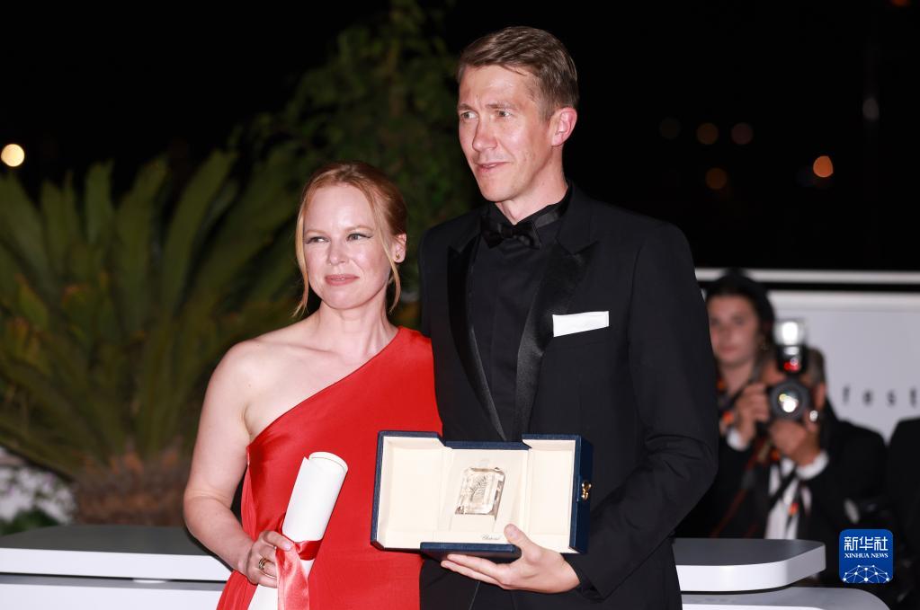 5月27日,在法國戛納,芬蘭影片《枯葉》的演員阿爾瑪·波斯蒂(左)和尤西·瓦塔寧代表導演阿基·考里斯馬基領(lǐng)取評審團獎。
