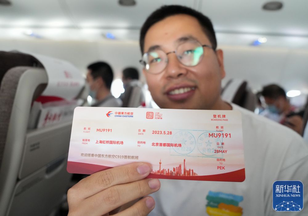 5月28日,旅客在飛機上展示C919首個(gè)商業(yè)航班東航MU9191的“紀念登機牌”。新華社記者丁汀