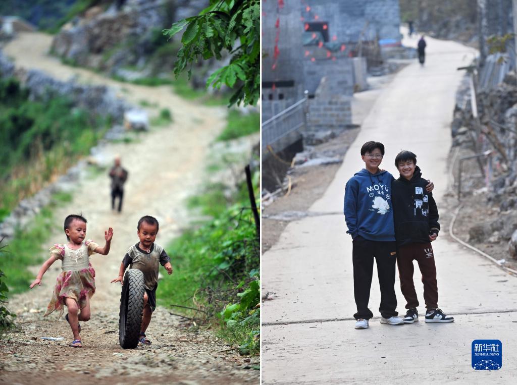 拼版照片:左圖為2012年7月16日,在大化瑤族自治縣板升鄉弄勇村,4歲的蒙宣宏(左)穿著(zhù)姐姐的舊衣服和同為4歲的藍小帥在一起玩耍;右圖為2023年1月21日,在大化瑤族自治縣板升鄉弄勇村,蒙宣宏(左)和藍小帥合影。蒙宣宏和藍小帥目前分別在板升鄉和大化縣城讀初二。