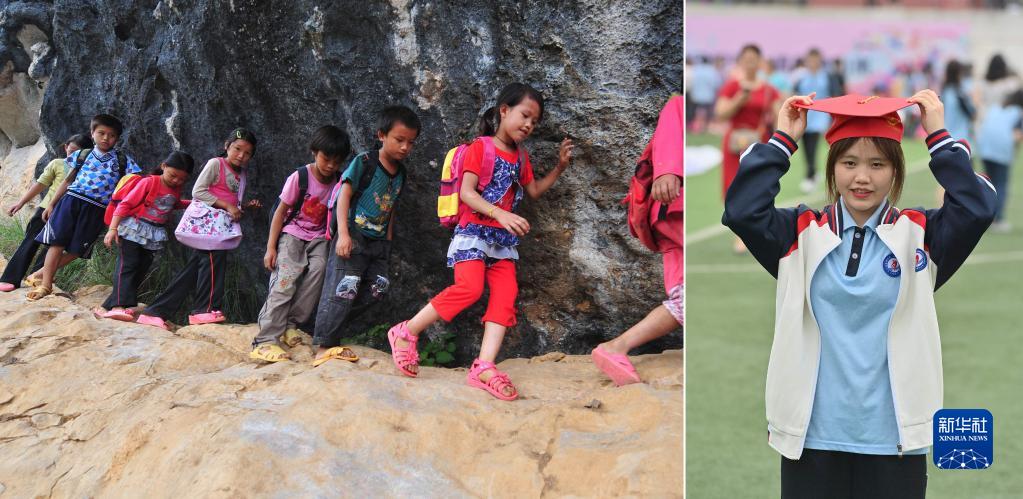 拼版照片:左圖為2012年9月3日,在大化瑤族自治縣板升鄉弄雷村,8歲的蒙麗丹(右一)爬懸崖去學(xué)校讀書(shū);右圖為2023年5月20日,蒙麗丹在廣西大化瑤族自治縣高級中學(xué)高三成人禮上(新華社記者胡星宇攝)。即將參加高考的蒙麗丹,希望以后能回到大山里當老師。