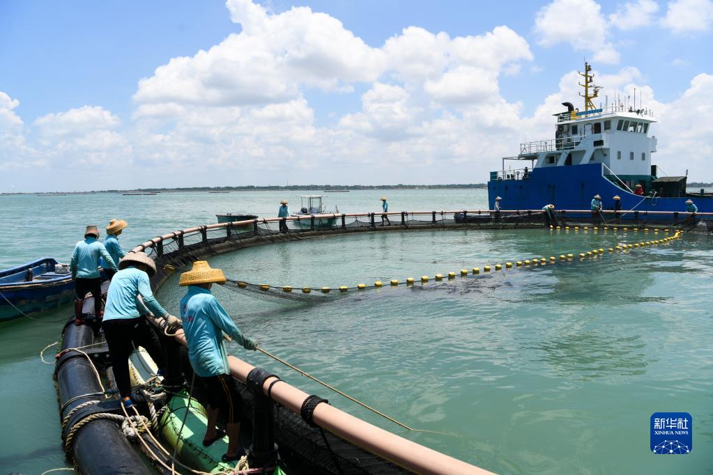 5月27日,在湛江市徐聞縣西連鎮,漁業(yè)工人在深海網(wǎng)箱拉網(wǎng)收獲金鯧魚(yú)。