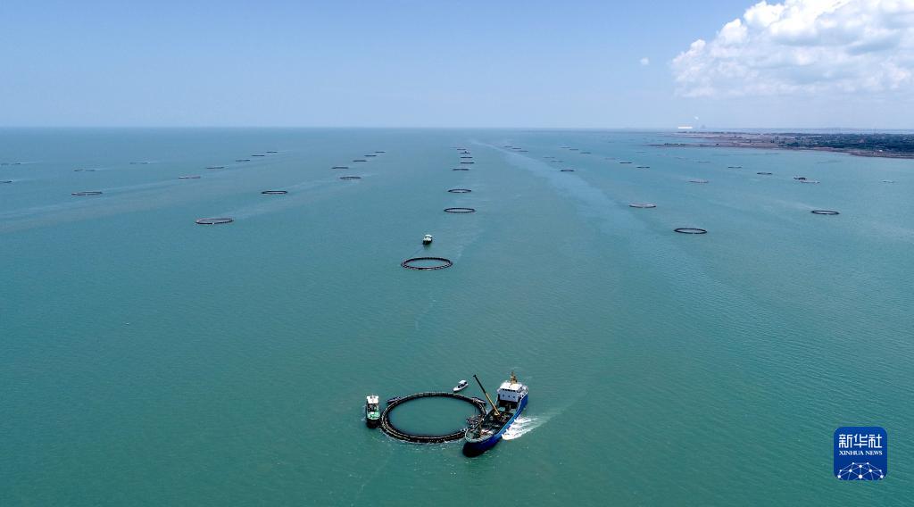 5月27日,在湛江市徐聞縣西連鎮,漁業(yè)工人從徐聞國橋深海養殖有限公司的金鯧魚(yú)深海網(wǎng)箱捕魚(yú)(無(wú)人機照片)。