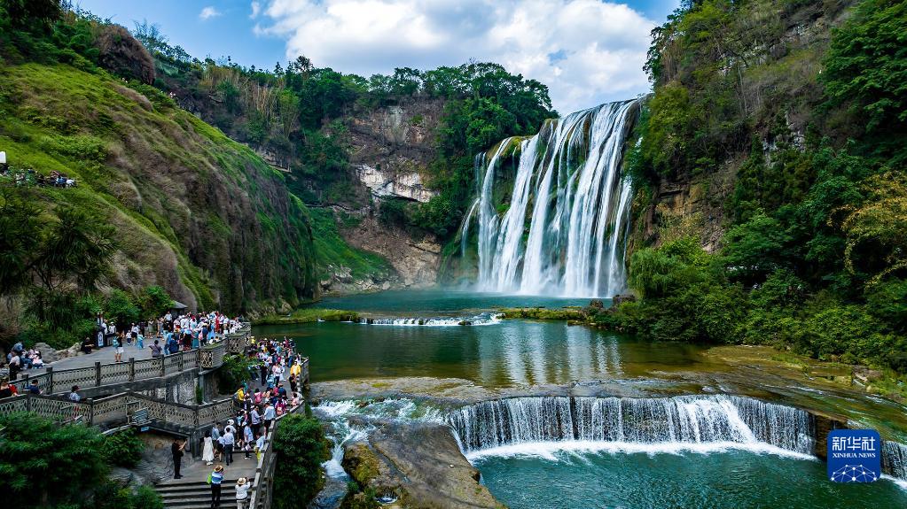 5月27日,游客在位于貴州省安順市的黃果樹(shù)瀑布景區游覽(無(wú)人機照片)。
