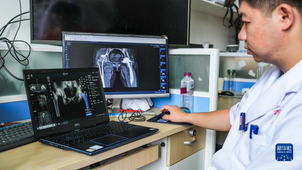 貴州省人民醫院骨科醫生通過(guò)AI軟件進(jìn)行髖關(guān)節置換手術(shù)的術(shù)前規劃(5月25日攝)。