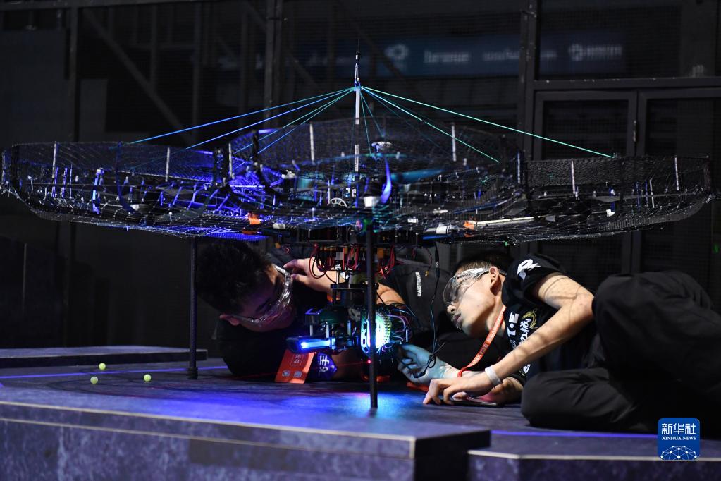 5月28日,大連交通大學(xué)TOE戰隊隊員在比賽間隙調試空中機器人。