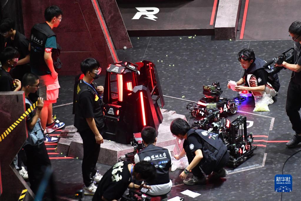 5月28日,深圳大學(xué)RobotPilots戰隊隊員在比賽間隙調整機器人。