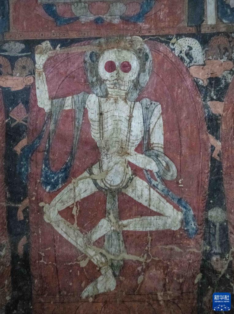 這是5月26日拍攝的皮央石窟壁畫(huà)中的骷髏造型。