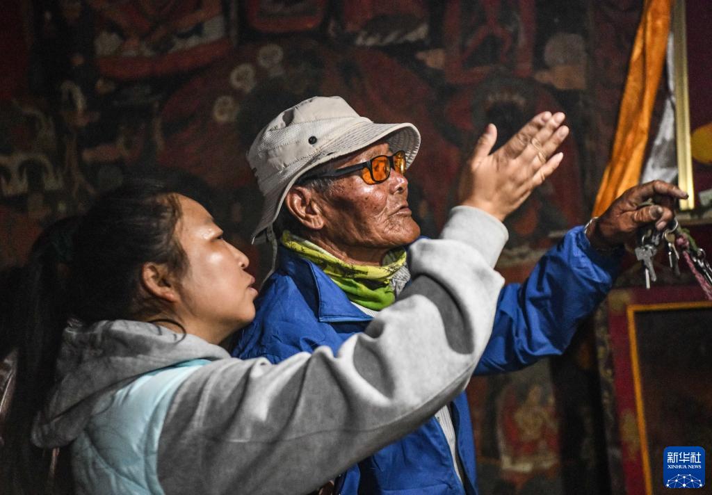 皮央和東嘎石窟遺址文保員仁增旺扎老人給游客講解壁畫(huà)(5月26日攝)。