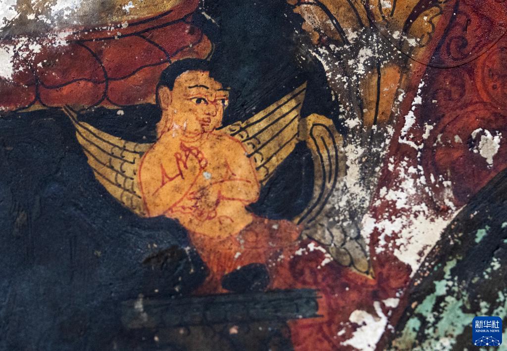 這是5月26日拍攝的皮央石窟壁畫(huà)中的長(cháng)翅膀的人物造型。