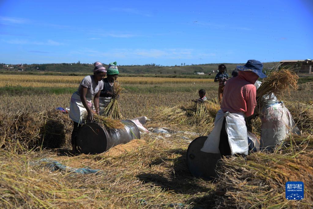 5月12日,在馬達加斯加首都塔那那利佛附近的馬義奇鎮,農民在中國國家雜交水稻工程技術(shù)研究中心非洲分中心的試驗田里收獲水稻。