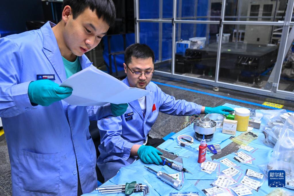 中國科學(xué)院空間光學(xué)系統在軌制造與集成重點(diǎn)實(shí)驗室科研人員組裝調試相關(guān)設備(5月25日攝)。
