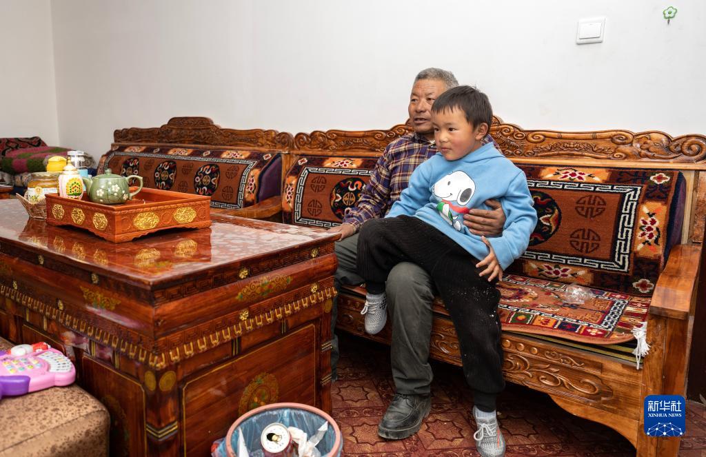 5月28日,洛桑占堆老人的兒子次仁久米和自己的孫子次仁頓珠在典角村的“五代房”里看電視。新華社記者 費茂華 攝