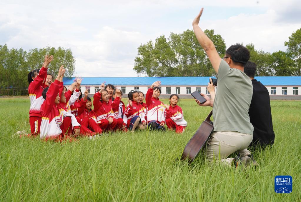 5月29日,在安達市任民鎮中心小學(xué),音樂(lè )老師在學(xué)校草坪上給音樂(lè )班的孩子們錄制短視頻。