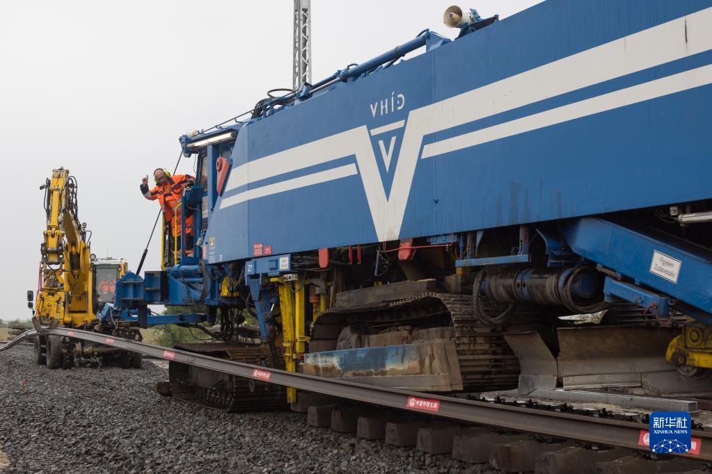 5月30日,在匈塞鐵路匈牙利段孔圣米克洛什-陶什站施工現場(chǎng),工作人員操作機械鋪設鋼軌。