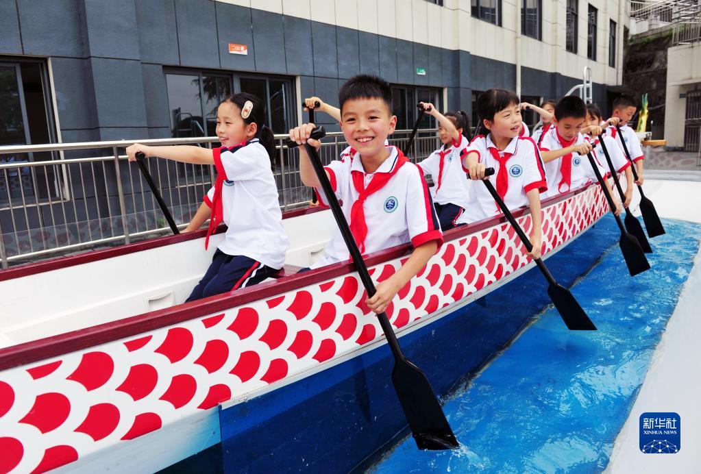 5月31日,湖北省宜昌市秭歸縣實(shí)驗小學(xué)學(xué)生在學(xué)校龍舟池里體驗劃龍舟,喜迎“六一”。