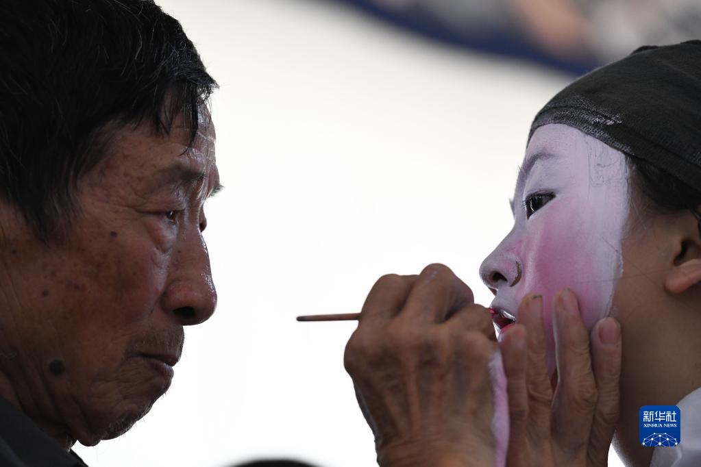 5月30日,75歲的民間老藝人邵茂凱(左)在給12歲的伏嶺鎮中心小學(xué)“徽劇童子班”學(xué)生王玉琴化妝。