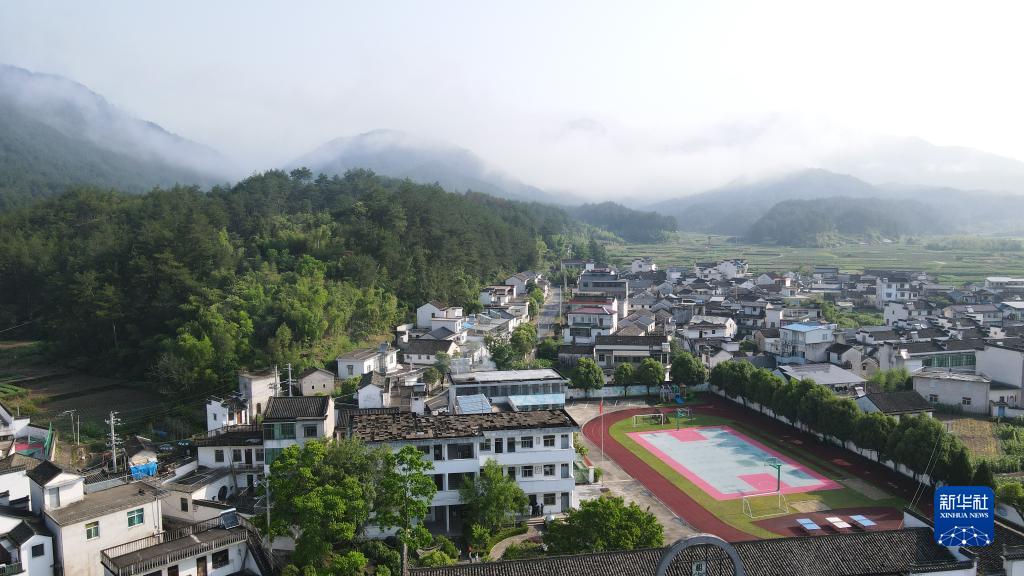 這是5月30日拍攝的安徽省宣城市績(jì)溪縣伏嶺村,畫(huà)面右下為伏嶺鎮中心小學(xué)(無(wú)人機照片)。