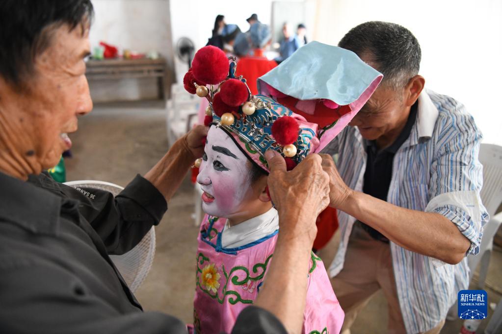 5月30日,民間老藝人在給9歲的伏嶺鎮中心小學(xué)“徽劇童子班”學(xué)生方冬冬(中)固定頭飾。