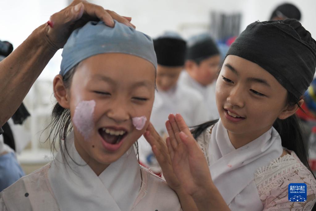 5月30日,伏嶺鎮中心小學(xué)“徽劇童子班”學(xué)生在徽劇展演前化妝。