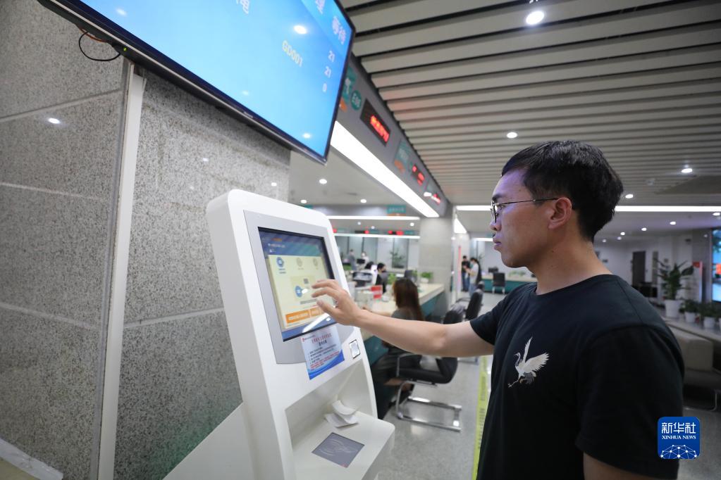 5月30日,在滁州市政務(wù)服務(wù)中心,市民用自助服務(wù)機領(lǐng)號排隊。
