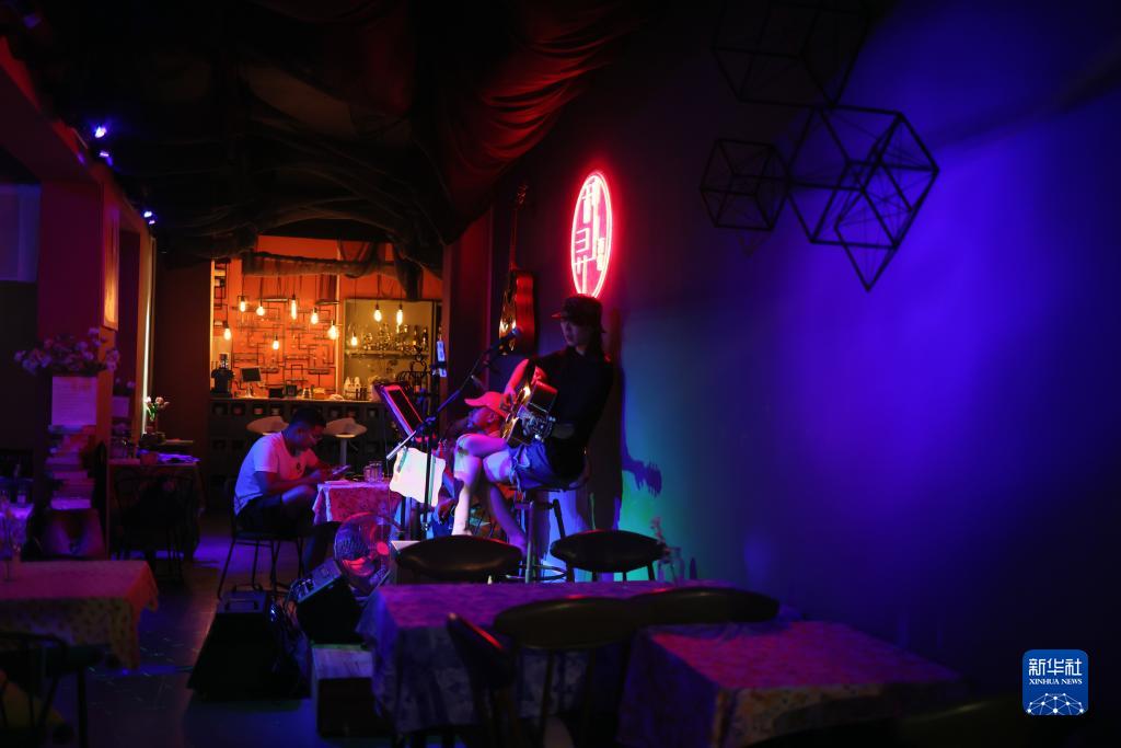 5月30日,一名歌手在普者黑景區仙人洞村一家酒館演出。