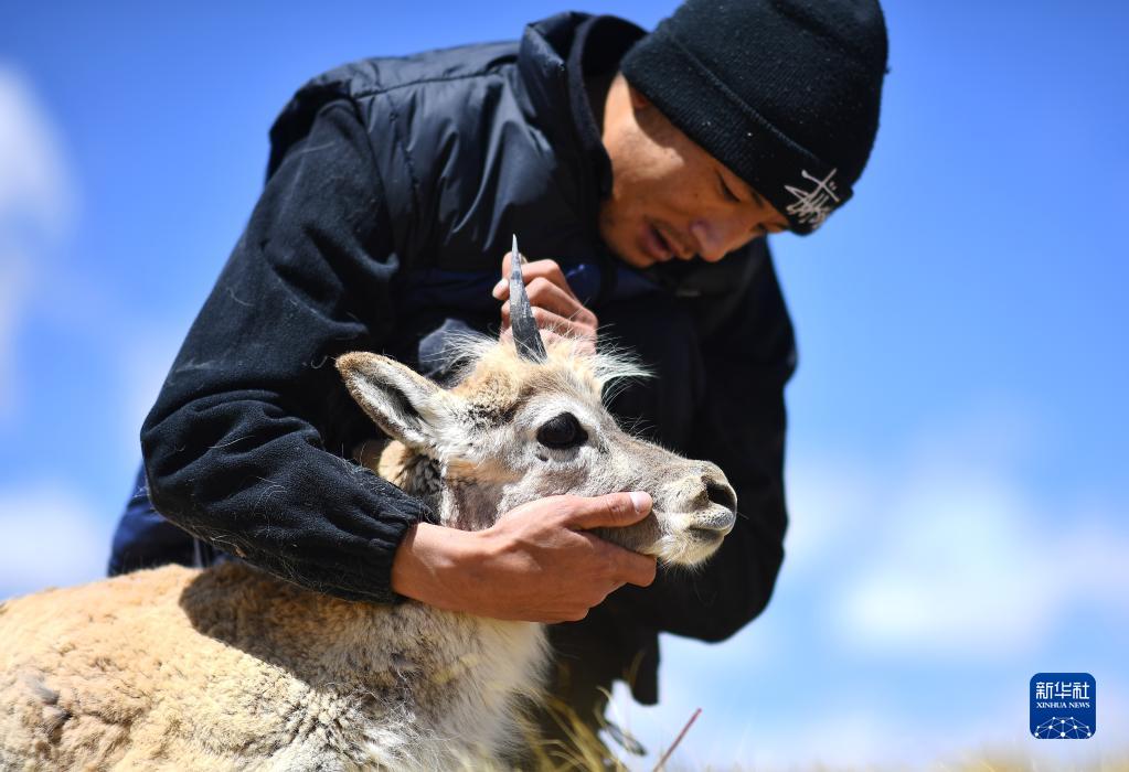5月30日,在可可西里國家級自然保護區索南達杰保護站,巡山隊員才文多杰和藏羚羊在一起。