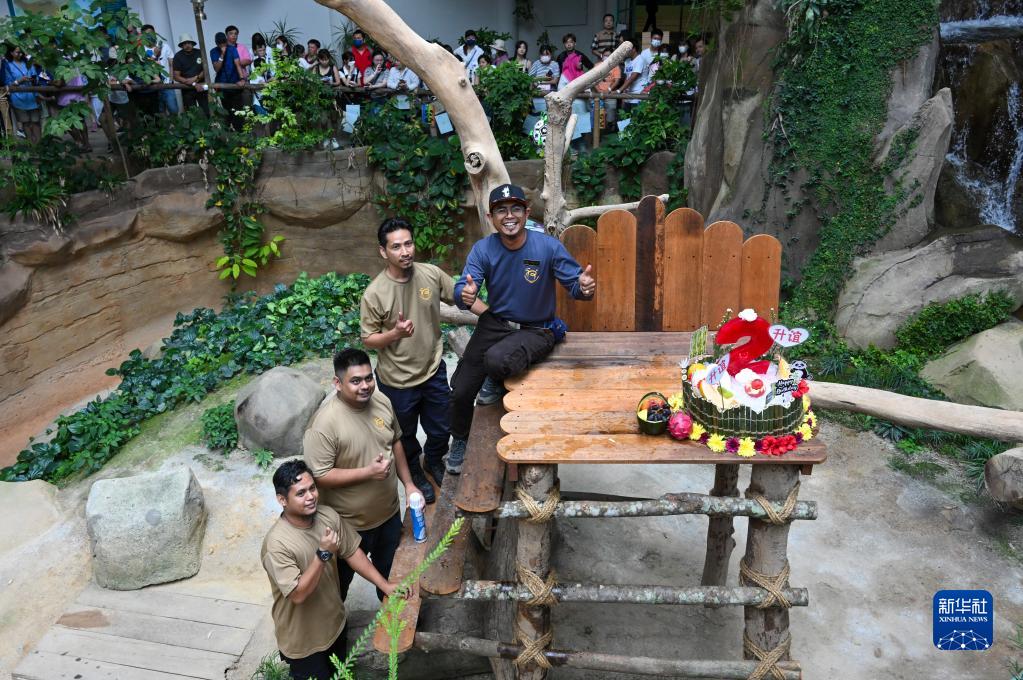 5月31日,在馬來(lái)西亞吉隆坡附近的馬來(lái)西亞國家動(dòng)物園,大熊貓飼養員阿克邁勒(右)和他的團隊與“升誼”的生日蛋糕合影。
