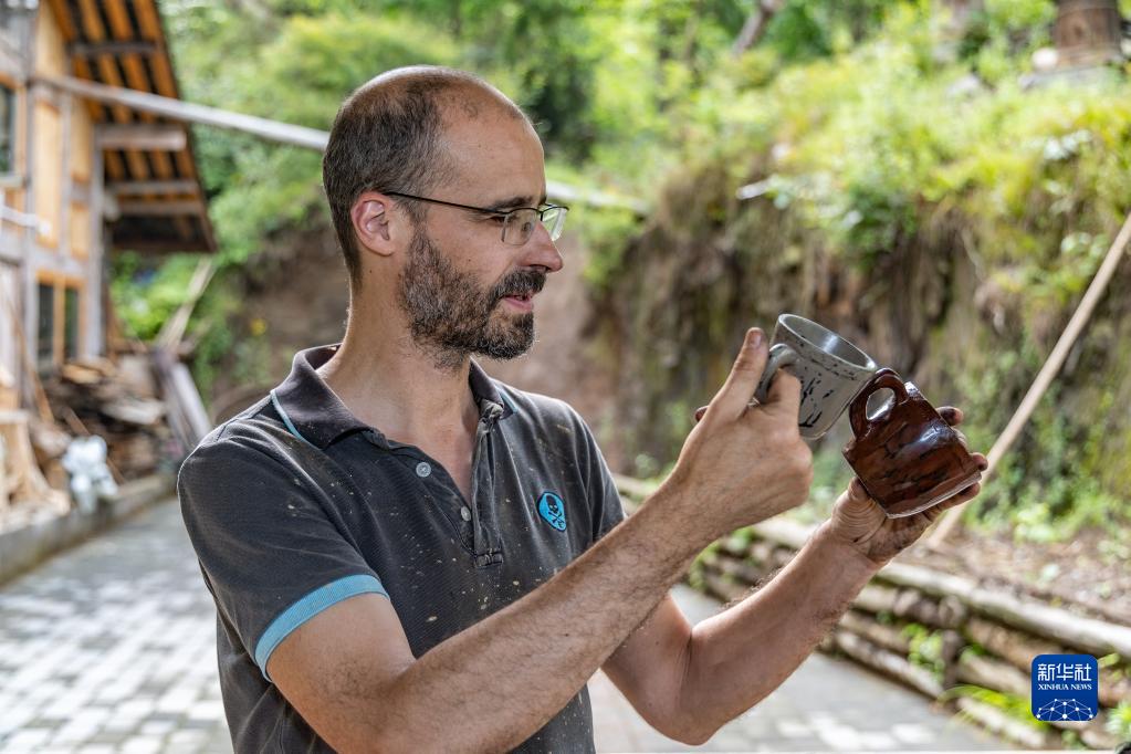 5月29日,在重慶市城口縣北屏鄉松柏村,文森·漆在工作室外查看拋光后的漆器。